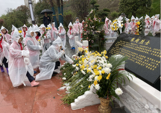 在张超烈士墓前,同学们有序上前,献上自己手中的鲜花,代表着无限的敬仰与缅怀之情。献花后,全体师生原地站立默哀一分钟……