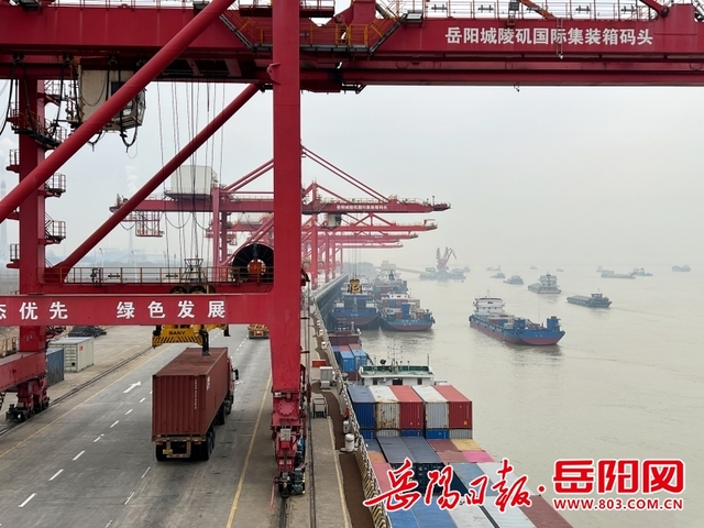 暮春4月,走进城陵矶港,眼前看到的是一幅绚丽多姿的画卷:蔚蓝的天空下,江水碧波荡漾,货船来往频繁,码头边的红色岸桥(集装箱起重机)正在作业,一派繁忙红火的景象。