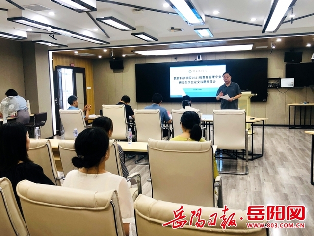 岳阳日报全媒体讯(黄灿 谢阳)7月4日,湖南理工学院教育科学学院为2021年教育硕士专业学位研究生组织了一场别开生面的选题指导会:指导专家全由岳阳市基础教育领域知名专家型教师担任,指导会场地放在学校教育硕士联合培养基地岳阳市教育科学技术研究院教育信息技术中心,岳阳市教育科学技术研究院院长李伟灵、岳阳楼区东升小学正高级教师王新菲等八位具有丰富基础教育实践经验的业界专家担任评委。教科院全体导师及2021级小学教育和教育管理两个专业的研究生参加。
