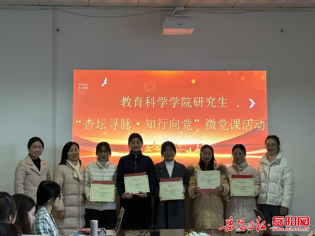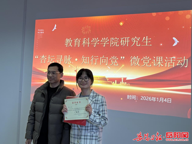 岳阳日报1月4日讯(通讯员 杨洁 王芙芳 卞子怡)1月4日下午,湖南理工学院教育科学学院研究生党支部举办“杏坛寻脉·知行向党”精品微党课展示竞赛活动。活动旨在以党员讲授微党课的形式,推动党的创新理论学习与教育学科特色、研究生学术实践深度融合,以赛促学、以讲促思,筑牢党员信仰之基,强化育人使命担当。